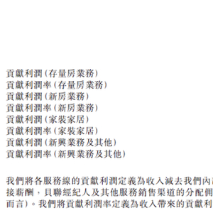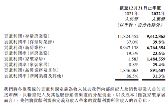 贝壳在财报中对贡献利润进行了解释,即收入减去内部经纪人及销售专业人员的直接薪酬、贝联经纪人及其他服务销售渠道的分配佣金、以及成本。而成本仅对家装家居而言。