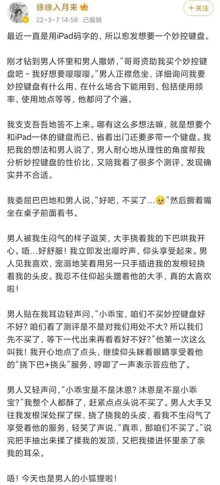 就像微博用户@徐徐入月来,因为在微博每天记录一些让人不适的情侣日常被发现,然后被扣上“娇妻”的帽子,紧接着就是一轮人肉网暴。