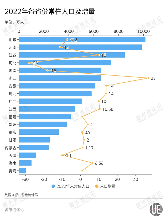 值得注意的是,尽管石家庄成功逆袭,但河北全省常住人口已连续两年负增长。2022年末,河北常住人口为7420万人,比上年末减少28万人。相较2021年减少16万人,减少量进一步扩大。