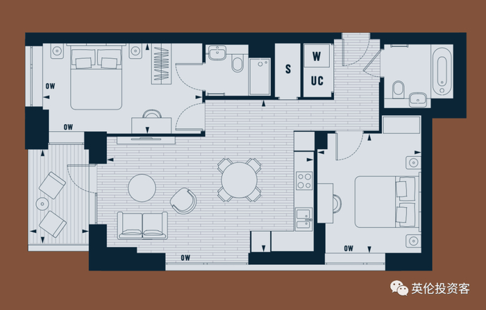 两房92.7万英镑(769万人民币),净面积75.8平米+阳台5平米,对应户型如下: