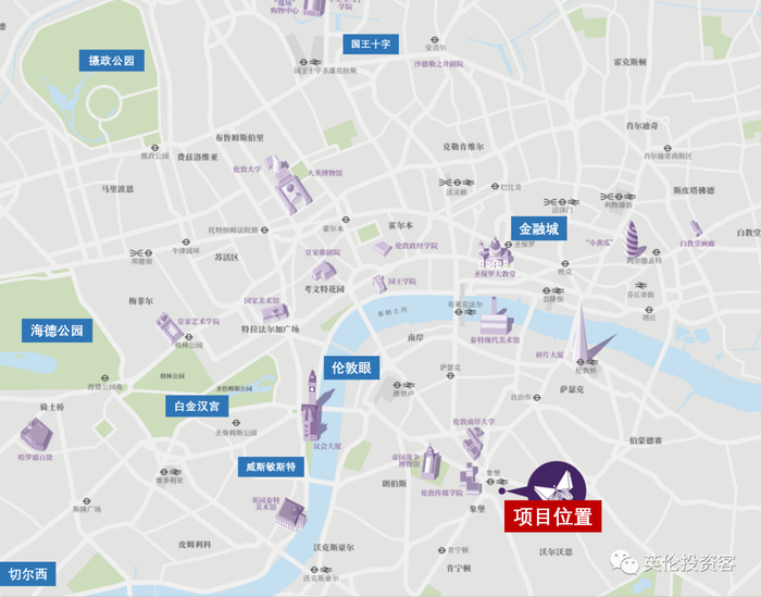 项目周边被众多地标环绕,包括伦敦眼、碎片大厦、金融城、大本钟、白金汉宫等,均在其半小时地铁通勤圈。