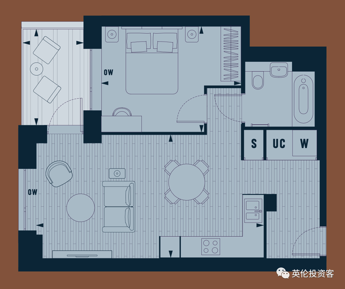 价格和户型方面,项目一房70.8万英镑(588万人民币),净面积53.3平米+阳台5平米,对应户型如下: