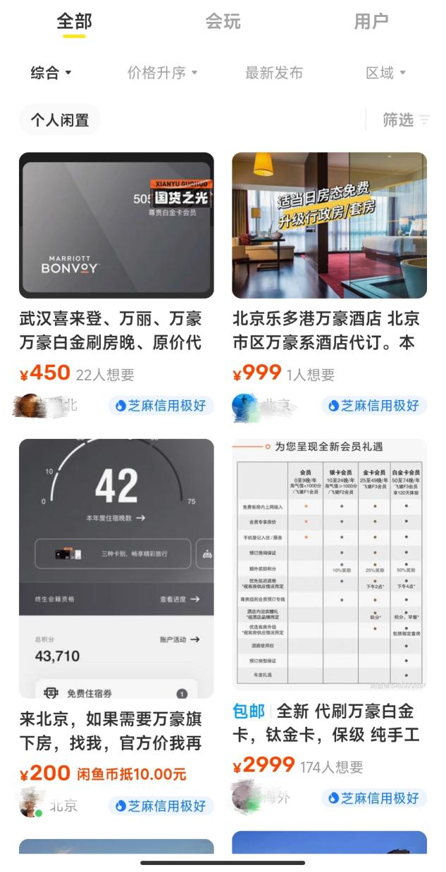 潘哥发现,闲鱼上的有些卖家,在兜售一种很新的东西。他们售卖的万豪酒店入住,每晚仅需200多元,但似乎不是用来给你住,而是给他们自己住,还可能根本没有人去住。