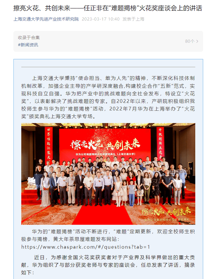 17日,上海交通大学发布了文章《擦亮花火、共创未来——任正非在“难题揭榜”花火奖座谈会上的讲话》,披露了华为创始人任正非对天才少年、校企合作等热点话题的看法,并剧透了华为2022年研发投入情况。