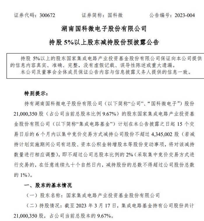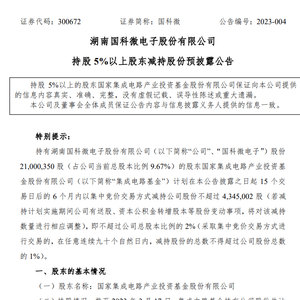 国科微公告,国家集成电路基金拟减持公司股份不超过434万股,即不超过公司总股本比例的2%。