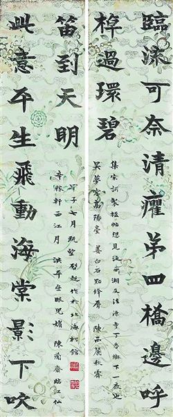 全联因人切事,缘事而述,绾合无痕,语同己出,显现出梁启超广博的知识体系和深厚的国学功底。梁启超后来在北海公园松坡图书馆,用八尺浅绿印花笺纸,以北魏体书就,赠予徐志摩。上联题写“集宋词,制楹帖,想见泛西湖及法源寺丁香树下一夜也”,下联落款“甲子七月既望,启超作于北海松馆”,钤白文印“新会梁氏”、朱文印“启超私印”。整幅作品气息高古,气韵生动,布局精美,雄强劲健;书法严整朴拙,方正峻厚,堪称梁启超集句联的代表作。