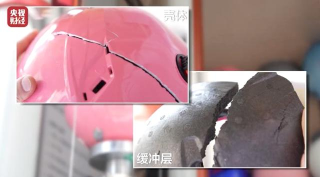 测试后多个头盔开裂,有的头盔只有壳体,没有泡沫缓冲层、有的头盔泡沫缓冲层使用劣质材料,均无法起到保护作用。