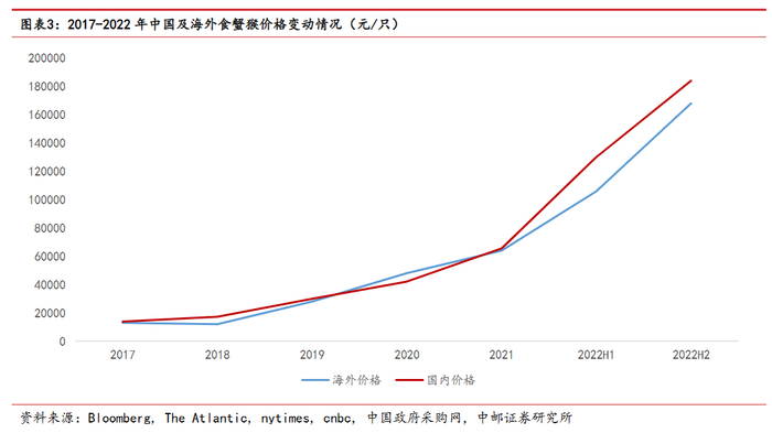 实验猴的最主要用处是创新药的临床前安全性研究,主要采购方为国内研发外包服务(CRO)公司。实验猴中使用量最大的食蟹猴,单价从2017年的不及7000元,一路飙升至2022年的18万元,飞涨逾20倍。