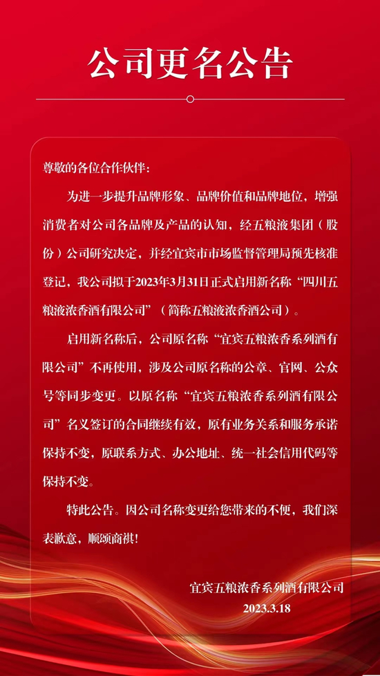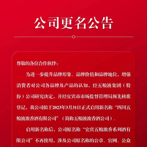 公告称,为进一步提升品牌形象、品牌价值和品牌地位,增强消费者对公司各品牌及产品的认知,经五粮液集团(股份)公司研究决定,并经宜宾市市场监督管理局预先核准登记,公司拟于2023年3月31日正式启用新名称“四川五粮液浓香酒有限公司”。