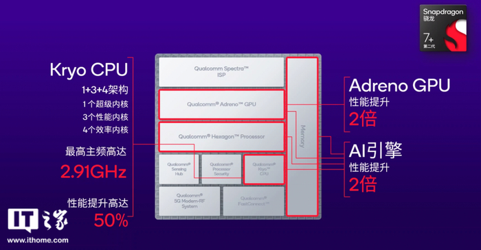 AI方面,第二代骁龙7+集成了高通传感器中枢,基于全新低功耗AI架构,包括一颗专用AI处理器、DSP和专属的内存。