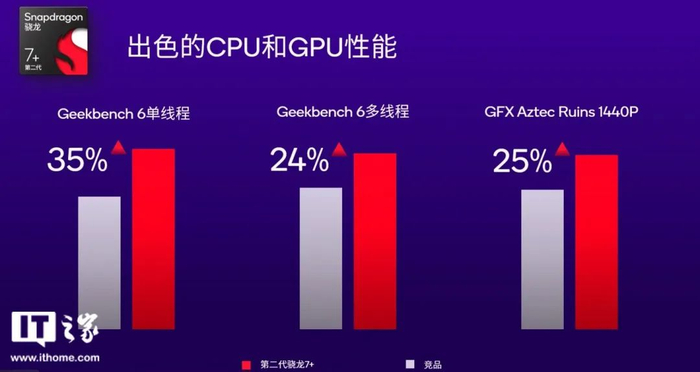 在第二代骁龙7+工程样机与同档位竞品的商用终端在Geekbench 6测试的对比中,第二代骁龙7+的CPU在单线程上领先达35%,在多线程上领先达24%。GPU性能方面,在GFX Aztec Ruins 1440P基准测试中,第二代骁龙7+相比竞品领先25%。