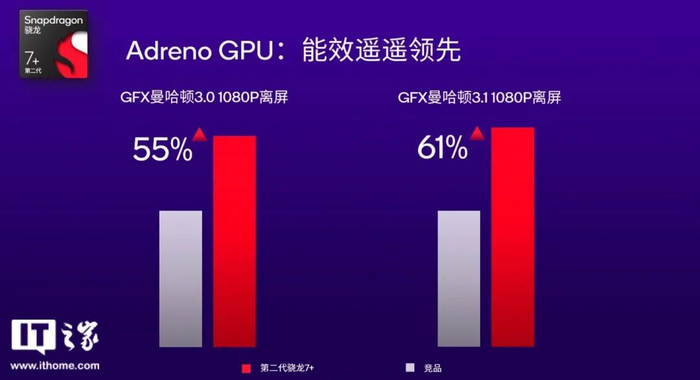 GPU能效方面,第二代骁龙7+的Adreno GPU在包括GFX曼哈顿3.0 1080P离屏测试和GFX曼哈顿3.1 1080P离屏测试中,领先优势分别达到55%和61%。