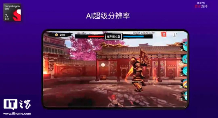 同时高通还首次在骁龙7系支持了AI超级分辨率特性,简称AI超分。它基于已经训练的AI超分神经网络模型,结合相应的游戏,可以进一步提升游戏分辨率,比如从原来的720p扩展到1080p甚至更高,从而提升整个游戏的画质。