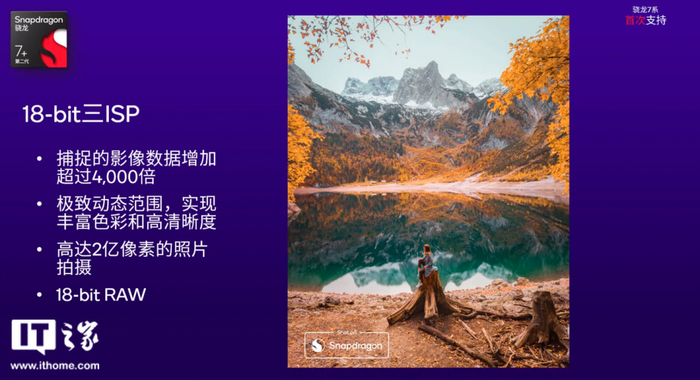 除了CPU、GPU,第二代骁龙7+移动平台在影像能力上也有升级。它是首个在骁龙7系上支持18-bit 三 ISP的移动平台。相比14-bit ISP,18-bit ISP捕捉的影像数据增加了超过4000倍,它可以提供极致动态范围,还原丰富色彩和实现高清晰度,拍摄效果相比14-bit ISP有了质的提升。