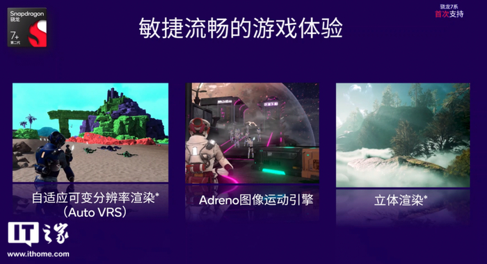 而在游戏方面,第二代骁龙7+也把把很多原来只在骁龙8系支持的游戏特性引入了进来,比如自适应可变分辨率渲染(Auto VRS),还有Adreno图像运动引擎。此外立体渲染也是首次在骁龙7系平台中支持的游戏特性。这一特性结合了虚幻引擎5的功能特性,通过与游戏工作室合作,可以对游戏中的烟雾和粒子效果进行进一步渲染,打造极致的逼真度。