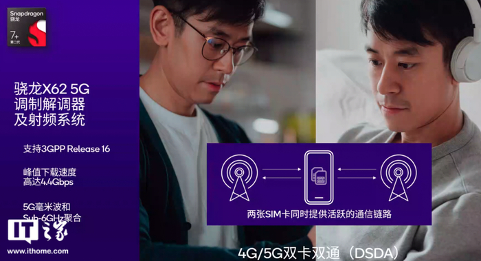 在通信方面,第二代骁龙7+集成了骁龙X62 5G调制解调器及射频系统,支持3GPP Release 16,峰值下行速率高达4.4Gbps。它还支持5G毫米波和Sub-6GHz,并且可以支持两者之间的载波聚合。