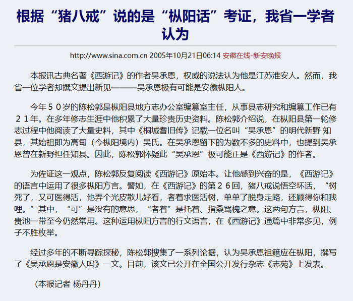 澎湃新闻记者还查询发现,安徽媒体安徽在线-新安晚报2005年1月曾刊文《根据“猪八戒”说的是“枞阳话”考证,我省一学者认为》写道:古典名著《西游记》的作者吴承恩,权威的说法认为他是江苏淮安人。然而,我省一位学者却撰文提出新见———吴承恩极有可能是安徽枞阳人。