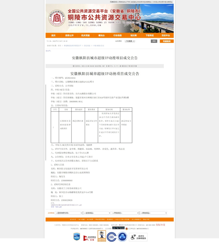 全国公共资源交易平台·铜陵市公共资源交易中心官网2021年12月就公布了一份《安徽枞阳县城市超级IP动漫项目成交公告》。