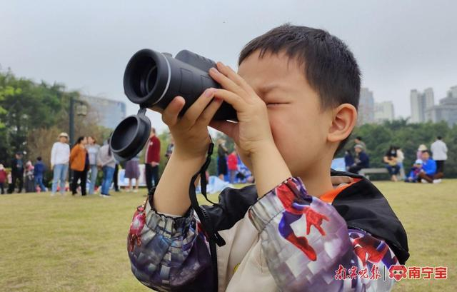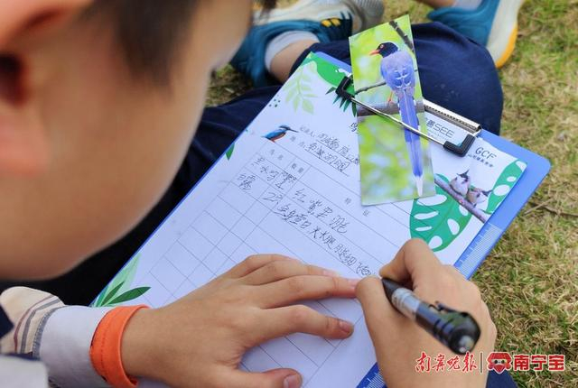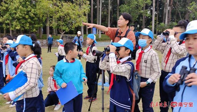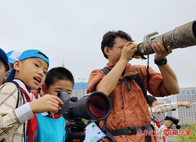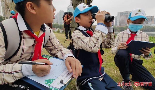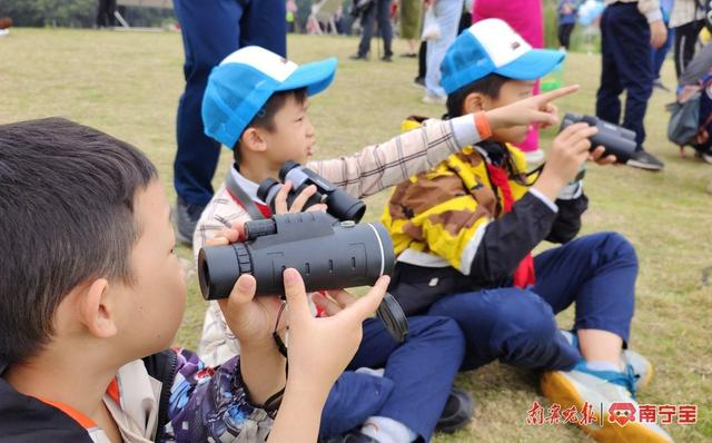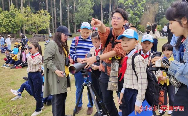 当天上午,为期两天的南宁市首届城市观鸟赛也拉开了序幕。“我看到了!湖面上有一只鸟儿在浮标上走来走去!”“我也看到了!有一只白鹭飞过湖面了!”“判断不出这是什么鸟啊,你赶紧问下老师!”……在观鸟赛比赛现场,科普指导老师带领一群青少年参与鸟类观察体验活动,同学们脖子上或挂着望远镜,或背着长焦相机,兴奋地围着指导老师说道。