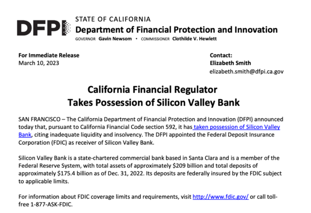 3月10日周五,加州金融保护和创新部(DFPI)发布公告显示,由于流动性不足和资不抵债,根据加州金融法典第592条,它们已经接管了硅谷银行,并控制了银行存款。