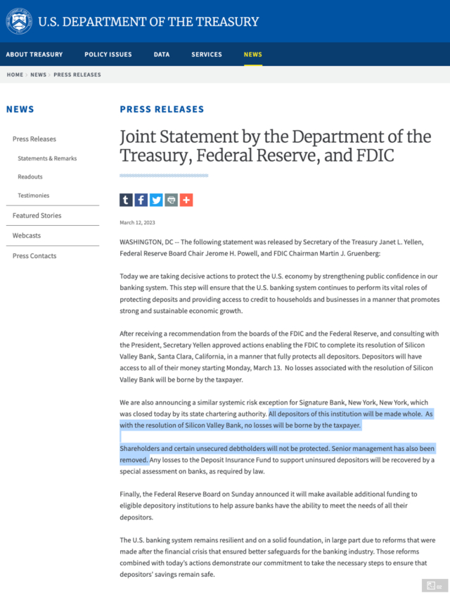 美联储、美国财政部和FDIC发布联合声明,从3月13日开始,储户可以支取他们所有的资金。所有亏空都将通过对银行系统其他部分征税来填补,美国纳税人不会承担任何损失。