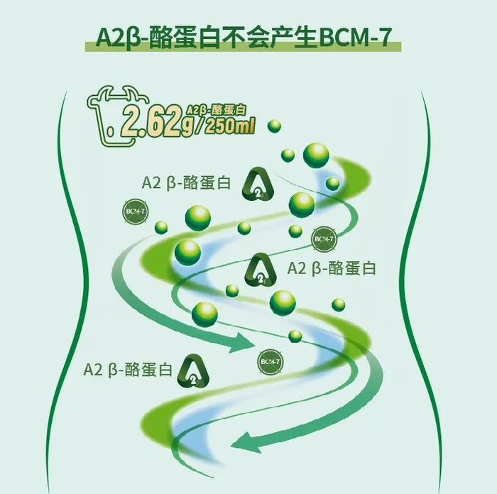 在于它们在体内的代谢反应不同,A1β-酪蛋白在消化过程中产生β-酪啡肽-7*( BCM-7) ,但A2β-酪蛋白不会。(*摘自PAL S,WOODFORD K,KUKULJAN S,ET AL. MILK INTOLERANCE,BETA CASEINAND LACTOSE[J].NUTRIENTS, 2015,7(9):7285-7297.)
