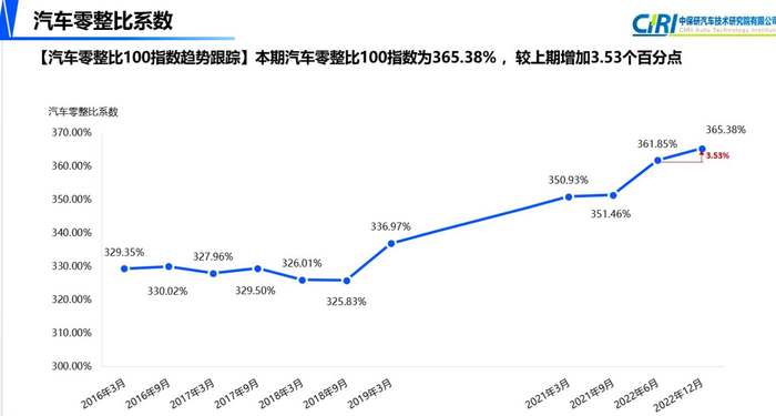 回顾前两期汽车零整比发布数据,第13期(数据采集日期为2021年9月30日)汽车零整比100指数为351.46%,常用配件负担100指数为17.32;第14期(数据采集日期为2022年6月30日)汽车零整比100指数为361.85%,常用配件负担100指数为18.21。