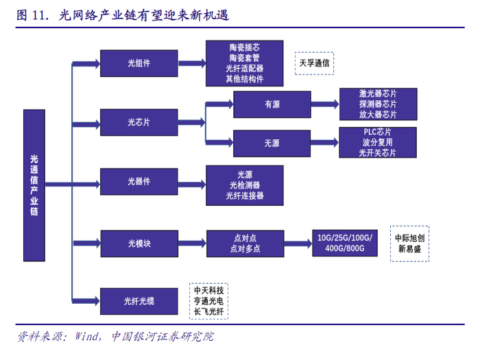 具体来看,光组件涉及的上市公司为天孚通信;光模块参与的公司为中际旭创、新易盛、光迅科技;光纤光缆涉及的上市公司为中天科技、亨通光电和长飞光纤。