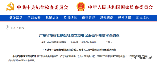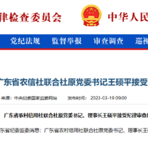 3月19日上午,中央纪委国家监委网站通报显示,广东省农村信用社联合社原党委书记、理事长王硕平涉嫌严重违纪违法,目前正接受广东省纪委监委纪律审查和监察调查。