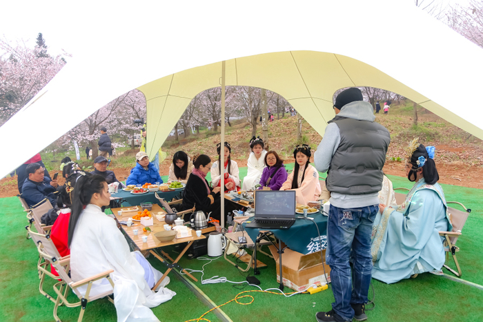 茶会现场,展出了7款优质的贵州春茶,前来品茗的游客络绎不绝,尤其吸引了不少前来樱花园拍照打卡的汉服妹妹。在万亩樱花园中,听贵州茶行业专家讲解贵州茶,学习贵州冲泡,体味贵州茶之乐,细品贵州春天的滋味。
