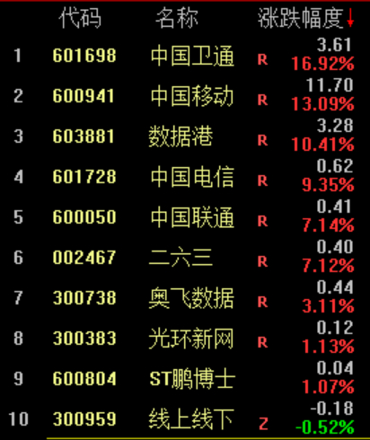 招商证券指出,三大运营商从铺路走向赋能,是数字经济发展的国家队、主力军和排头兵,不仅能够带来运营商自身的估值体系重构,同时有望为运营商产业链上的核心供应商与合作伙伴带来新的机遇。建议关注与运营商深度绑定,并且在运营商体系内具有优势竞争地位的公司,并重点关注与运营商政企与云业务相关的产业链公司。