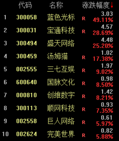 本周,云游戏板块表现强势。该板块个股中,蓝色光标表现最为突出,一周累计涨幅达到49.11%,宝通科技、盛天网络则均涨逾25%。