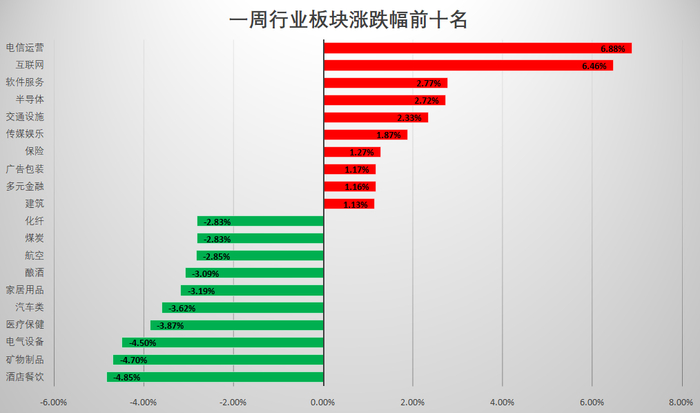 本周,电信运营板块表现突出,一周累计涨幅达到6.88%,居于一周行业涨幅榜首位。个股方面,中国卫通一周涨幅达到16.92%,中国移动、数据港同样涨幅居前,均超10%。