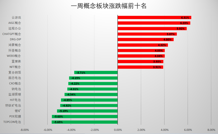 从本周板块表现来看,行业板块中,电信运营、互联网、软件服务等板块上涨,酒店餐饮、矿物制品、电气设备等跌幅居前;概念板块中,云游戏、AIGC概念、远程办公等板块表现相对较好,TOPCon电池、POE胶膜、锂矿等跌幅居前。