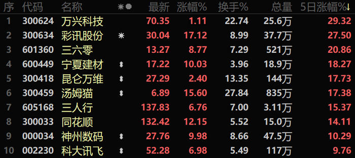 ChatGPT在本周表现同样出彩,一周累计涨幅达到5.07%,在一周概念板块涨幅榜中位居前列。在该板块个股方面,万兴科技表现亮眼,一周累计涨幅达到29.32%,彩讯股份、三六零等涨幅居前。