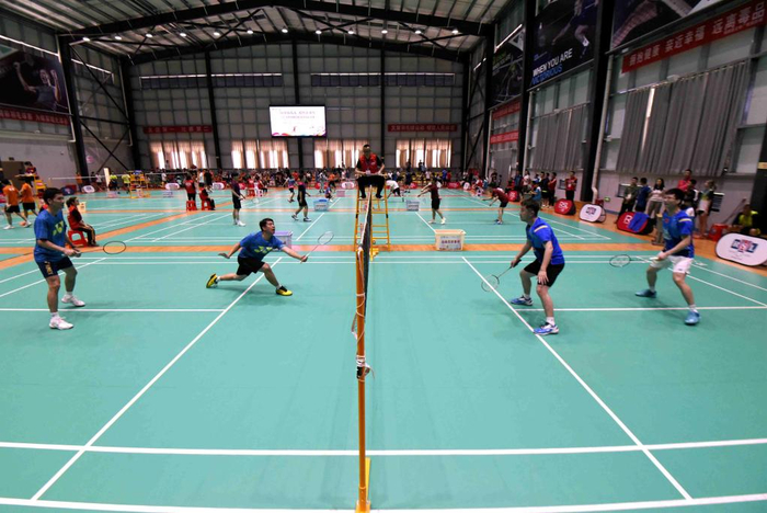 运动员在贵州省锦屏县体育运动场羽毛球馆参加2021年“锦屏亚狮龙杯”羽毛球赛(2021年5月2日摄)。新华社发(杨晓海摄)