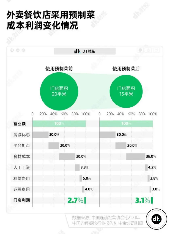 另外,中金公司测算:一家普通规格外卖店,使用预制菜之后食材成本占比会从30%提升至36%,但预制菜对厨房空间、厨师技能要求低,摊算下来,利润率反而能从2.7%增加到3.1%。