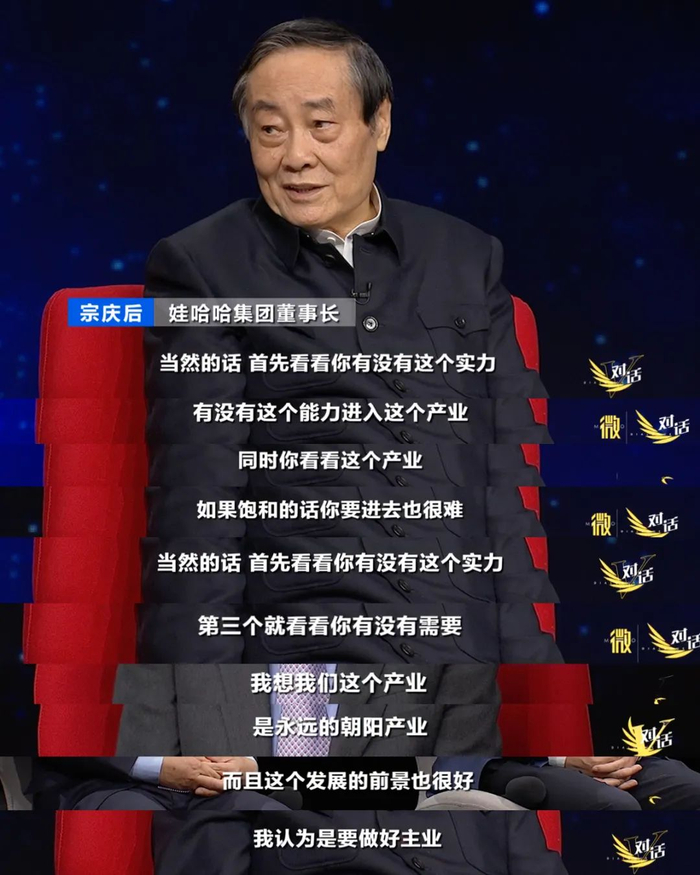 作为本季《对话》年龄最大的老友,宗庆后在采访中表示:“(我)感到高兴,还能为国家做贡献,还能做自己想做的事情,反而更加年轻,更加有活力。” 三十几年间,由宗庆后创办的娃哈哈集团已从14万元借款起家,发展成为中国规模最大的饮料企业之一。
