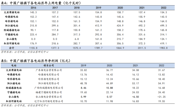 大亚湾核电基地和阳江核电基地对公司净利润贡献最大。位于大亚湾核电基地的大亚湾核电站为我国建成的第二座核电站,于1994年5月6日正式投入商业运行,其电量主要出售给香港。由于投运时间长,在折旧和财务费用降低后,大亚湾核电站呈现出优异的经营效益,近几年的度电净利润维持在0.2元/kWh以上。阳江核电站是我国一次核准开工建设容量最大的核电项目,6台机组总装机6.5GW,2022年阳江核电上网电量499.3亿kWh,净利润达到54.91亿元。