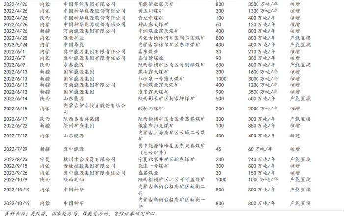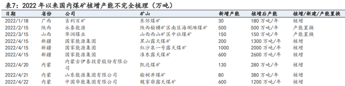 据国家能源局及中国煤炭工业协会统计与信息部初步统计,2022年国内煤炭总产量约44.5亿吨,同比增长约8%,全年实现增产煤炭3.2亿吨。通过对国家发改委、国家能源局及煤炭资源网披露的数据进行初步梳理,2022年以来我国通过产能置换新增产能超6000万吨,通过技术改造等核增产能约8000万吨,与煤炭增产数据之间存在一定的差距。参考CCTD中国煤炭市场网的分析,目前煤炭增产部分或有其他因素,比如将原来的表外产量进了表内统计、煤质下降带来的用量增加等,而以上因素都可能造成煤炭产量“虚高”。考虑到核增产能释放与新建煤矿投产仍需时间,实际煤炭增量释放有限,未来几年煤炭供给可能仍处于相对偏紧状态。