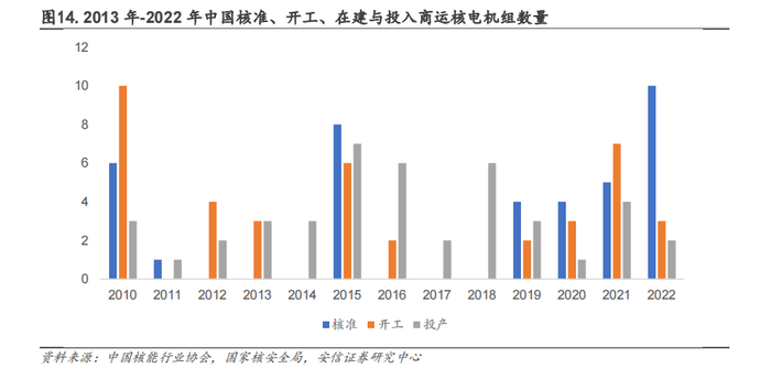 限电背景下保供需求迫切,核电审批有望持续加速。我国连续三年多省份出现限电现象,能源保供需求刻不容缓,核电核准数量有望获得持续提升。自从2011年日本福岛核事故以来,在相当长的一段时间里,我国核电审批一度受限。2015年一次核准8台机组后,2016-2018年我国核电审批进入了三年停滞期,直到2019年重启核电审批。随后三年每年核准机组数量稳定在4-5台。而2022年,国务院常务会议共核准了10台核电机组,较2021年数量翻倍,审批显著提速。根据《中华人民共和国国民经济和社会发展第十四个五年规划和2035年远景目标纲要》以及中国核能行业协会发布的《中国核能发展报告(2021)》,预计到2025年,国内在运核电装机达到7000万千瓦,在建核电装机达到5000万千瓦;到2030年,核电在运装机容量达1.2亿千瓦,约是目前的2.3倍,核电发电量约占全国发电量的8%;到2035年,我国核电在运和在建装机容量将达到2亿千瓦左右,发电量约占全国发电量的10%左右。2023年3月两会期间,全国政协委员、中国广核集团董事长杨长利建议:在确保安全前提下,未来十年保持每年核准开工10台以上核电机组。