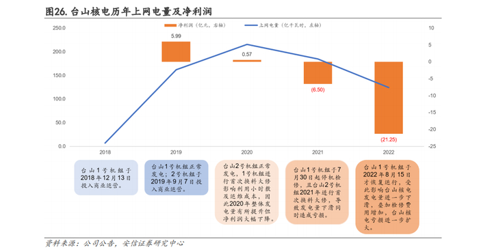 根据公司历年年报,自2018年台山首台机组投产以来,2019-2022年台山核电厂分别实现净利润5.99亿元、0.57亿元、-6.5亿元、-21.25亿元。2022年8月,台山1号机组重启后两台机组有望在2023年全年实现正常运行,业绩制约因素消除有望对2023年公司整体业绩形成较大拉动。