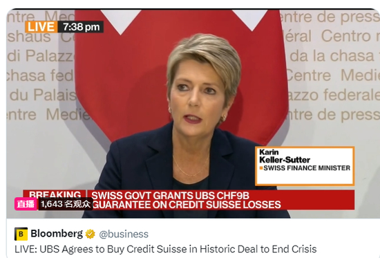 瑞士财长表示,与瑞信和瑞银的首次谈判于3月15日开始,政府在四天内就瑞信问题举行了四场会议。优先考虑瑞士的利益,一旦瑞信破产将会产生严重后果,政府的这个解决方案能稳定瑞信和金融市场,此举是根据紧急法作出的决定。政府对于瑞信无法自行解决危机“感到遗憾”,客户已经失去了对瑞信的信任。这笔交易的风险比其他情况要低,能够奠定稳定性的基础。