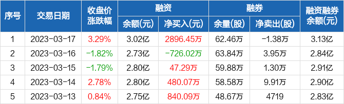 融资方面,当日融资买入5980.92万元,融资偿还3084.47万元,融资净买入2896.45万元。融券方面,融券卖出6.08万股,融券偿还7.46万股,融券余量62.46万股,融券余额1079.22万元。融资融券余额合计3.13亿元。