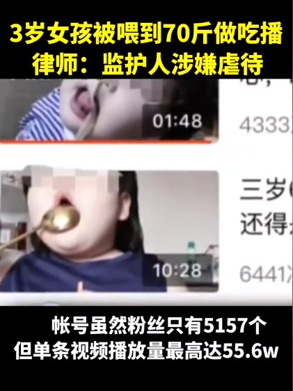 “食量惊人”“几秒吃完”“六个包子”……2020年,一名年仅3岁的小网红被父母喂到70斤,超过正常3岁女童体重2倍多,目的就是为了将孩子打造“胖妹”人设做吃播。面对网友善意提醒,家长仅用“孩子爱吃没办法”一味搪塞,最终账号被封禁处理。