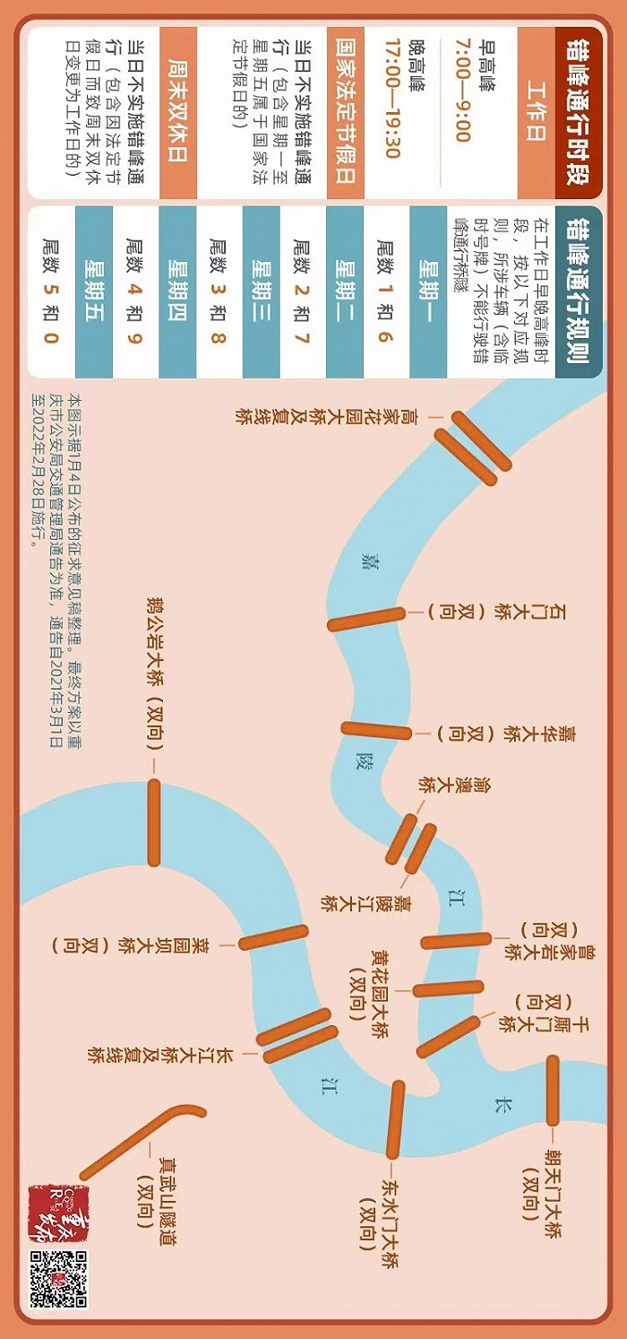 常年顶着“第一堵城”的帽子,重庆开始积极治理交通拥堵。2021年3月起,重庆实施了“15+1”高峰时段桥隧错峰通行方案,即在工作日早晚高峰时期,15座桥梁和1条隧道对私家车尾号限行。