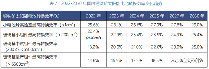 近几年来,学术与工业界的研究人员通过不断优化钙钛矿太阳能电池的配方和工艺,一定程度上提升了钙钛矿电池的稳定性。目前,小电池片实验室最高转换效率为 25.6%,玻璃基小组件最高转换效率为 22.4%(26.02cm²)。处于小规模试验线量产阶段的玻璃基组件中试最高转换效率达到 18.2%,实验室柔性组件最高转换效率为 20.2%(12.1 cm²)。