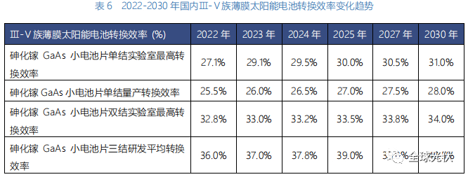 较为成熟的电池结构有晶格匹配的单结 GaAs 电池、晶格匹配的 GaInP/GaAs 双结电池,以及晶格失配的 GaInP/GaAs/GaInAs 三结电池。由于该领域的设备及技术独特性,进行研发的研究机构及企业较少。2022 年,双结电池实验室最高转换效率达到 32.8%,三结电池的研发平均转换效率达到 36%。