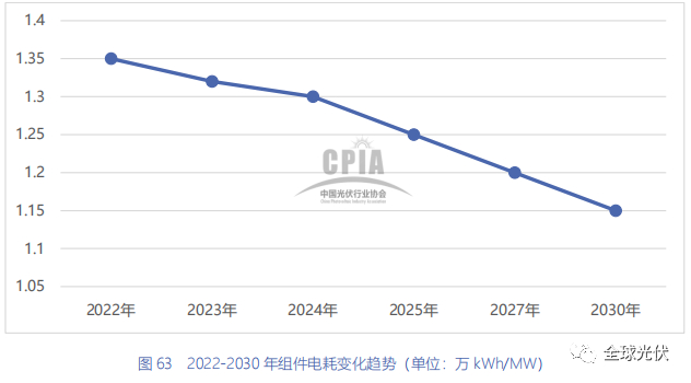组件电耗包括生产系统耗电,辅助生产系统耗电量或分摊量,不包含办公区域及生活用电。2022 年组件生产电耗为 1.35 万 kWh/MW,未来几年组件电耗随着电池效率的提升以及组件的大功率化等呈下降趋势。