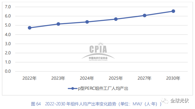 组件人均产出率主要指产线直接员工的人均产出(不含管理人员)。2022 年,单线组件功率提升,我国组件工厂人均产出率也提升至约 4.7MW/(人·年)。未来随着产线自动化、数字化和智能化水平的提高,以及组件功率的提升,人均产出率将不断增长,到 2030 年有望达到6.5MW/(人·年)。